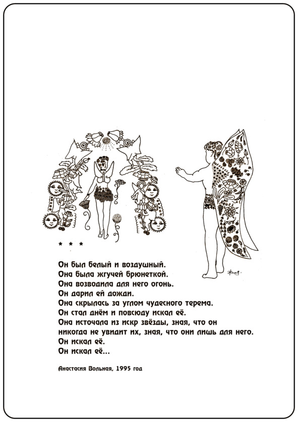 Он был белый и воздушный.Она была жгучей брюнеткой.Она возводила для него огонь.Он дарил ей дожди.Она скрылась за углом чудесного терема.Он стал днём и повсюду искал её.Она источала из искр звёзды, зная, что онникогда не увидит их, зная, что они лишь для него.Он искал её.Он искал её.1994 год