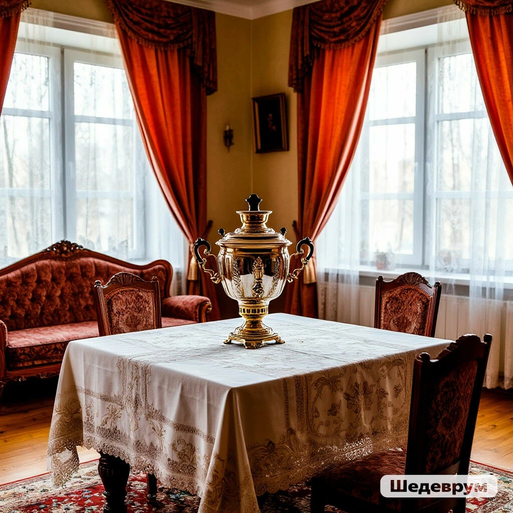 Солнце щедро заливало угловую гостиную, проникая сквозь два огромных окна и окрашивая комнату в теплые золотистые тона. Интерьер дышал утонченным вкусом: антикварный диван с обивкой цвета бордо томился у окна, словно в ожидании гостей. В центре комнаты расположился полированный прямоугольный стол, над которым сиял медный самовар. Три мягких стула, словно близнецы дивана, окружали стол. Четвертый скромно примостился у стены. Плотные шторы, которые сочетались с обивкой мебели, обрамляли окна, словно драгоценные самоцветы.
