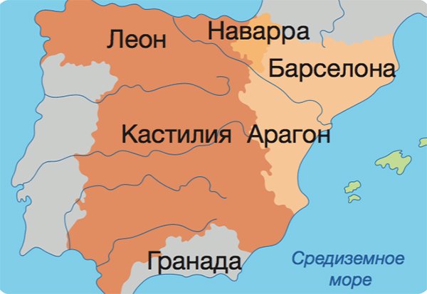 ОБЪЕДИНЕНИЕ ИСПАНИИ. В 1469 г. противоречия между двумя основными христианскими королевствами – Арагоном и Кастилией – были сняты династическим браком: Фердинанд Арагонский (1452–1516) женился на Изабелле I Кастильской (1451–1504). Это событие считается началом объединения Испании, хотя до окончательного политического объединения потребовалось ещё несколько десятков лет.