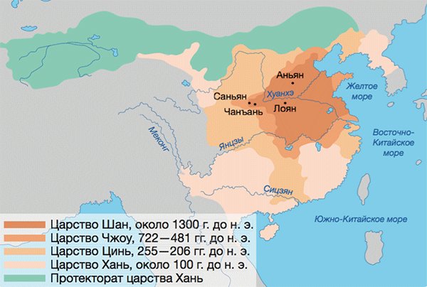 ПЕРВЫЕ ДИНАСТИИ. Развитие цивилизации на территории Китая началось в бассейне реки Хуанхэ свыше 5000 лет назад. В легендах и мифах встречаются упоминания о временах правления трёх властителей и пяти императоров, после эпохи которых Китаем правила династия Ся (2070–1600 гг. до н. э.). Затем её сменила династия Шан (1600–1046 гг. до н. э.), управлявшая царством Шан-Инь.