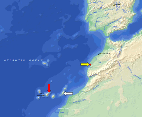 Сафи (желтая стрелка), остров Тенерифе (красная стрелка), остров Фуэртевентура (белая стрелка)