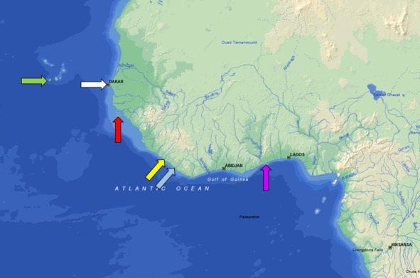 Устье реки Сан-Паул (желтая стрелка), устье реки Цестос (голубая стрелка), Виннеба (сиреневая стрелка), острова Биджагос (красная стрелка), Дакар (белая стрелка), острова Зеленого Мыса (зеленая стрелка)
