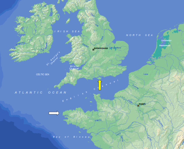 Остров Уэссан (белая стрелка), остров Уайт (желтая стрелка)