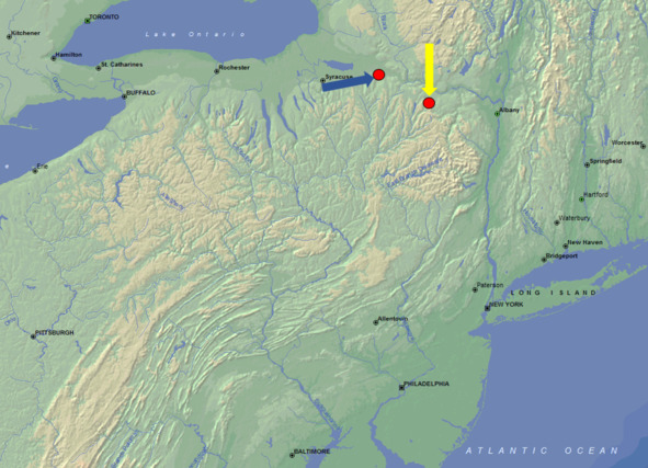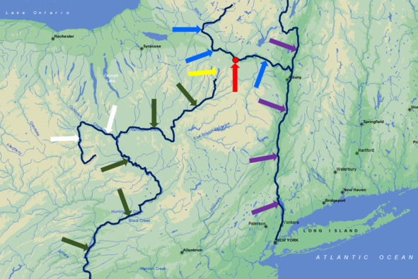 Каноджахари (красная стрелка), река Могавк (синие стрелки), река Гудзон (сиреневые стрелки), река Саскуэханна (зеленые стрелки), река Чемунг (белые стрелки), озеро Отсего (желтая стрелка)