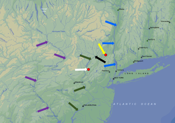 Минисинк (белая стрелка), Гошен (желтая стрелка), река Саскуэханна (сиреневые стрелки), река Делавэр (зеленые стрелки), река Гудзон (синие стрелки), место впадения реки Лакаваксен в реку Делавэр (черная стрелка)