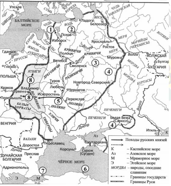 6) Во время походов князя, которые обозначены на схеме, государством управляла его мать.