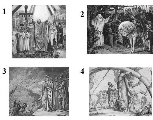 16. Какая из представленных репродукций картин отражает событие из жизни князя, о котором идет речь в предыдущем задании? В ответе запишите цифру, которой обозначена эта репродукция. Укажите в каком году произошло это событие.