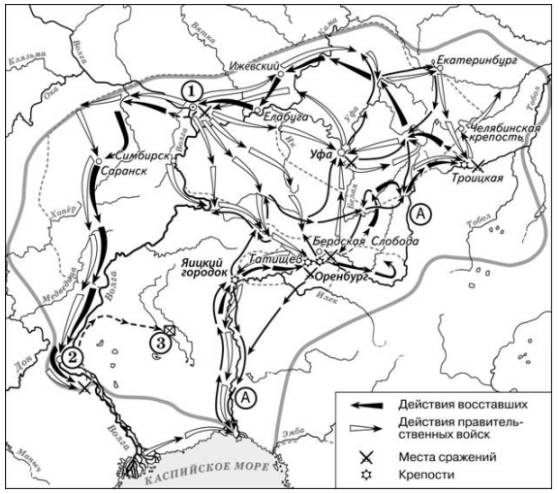 3) вооруженные отряды, действия которых обозначены черными стрелками, состояли только из казаков и государственных крестьян.