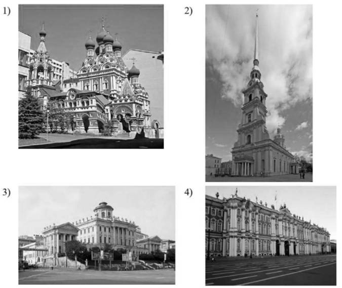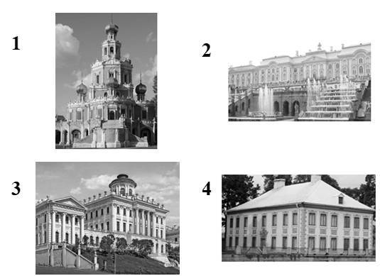 16. Какой из представленных ниже памятников архитектуры был создан в царствование императрицы, изображенной на марке? В ответе запишите цифру, которой обозначен этот памятник архитектуры. Укажите архитектурный стиль, в котором создан данный памятник архитектуры.