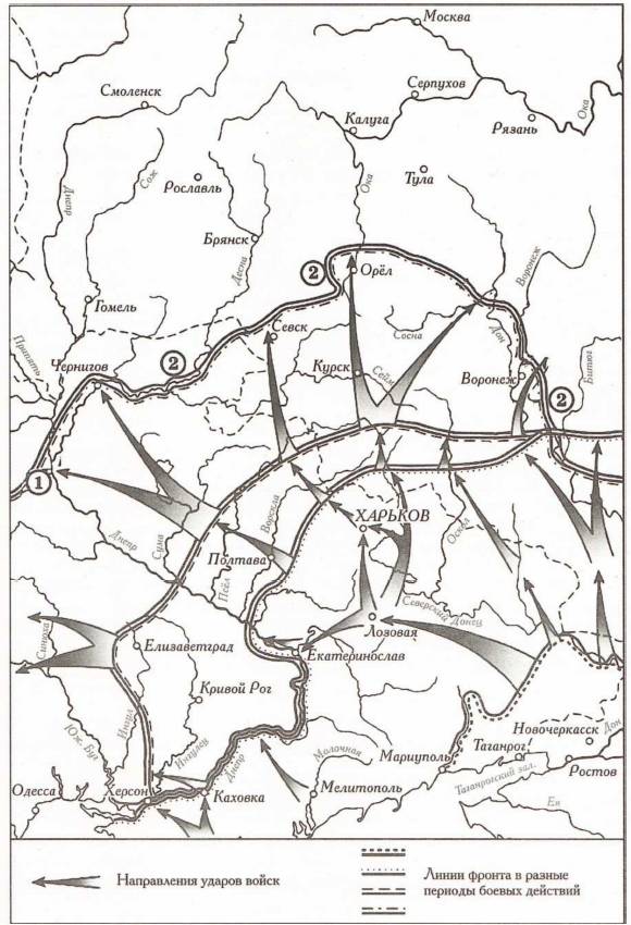4) Войскам, действия которых обозначены на схеме стрелками, не удалось продвинуться дальше линии, обозначенной на схеме цифрой «2».