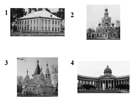 16. Какой из представленных памятников архитектуры был создан в период правления императора, в период правления которого было образовано общество, восстание которого изображено на марке? В ответе запишите цифру, которой обозначен этот памятник архитектуры. Укажите название данного памятника архитектуры.