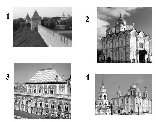 16. Какой из представленных памятников архитектуры был создан в период правления царя, изображенного на картинке? В ответе запишите цифру, которой обозначен этот памятник архитектуры. Укажите название данного памятника архитектуры.