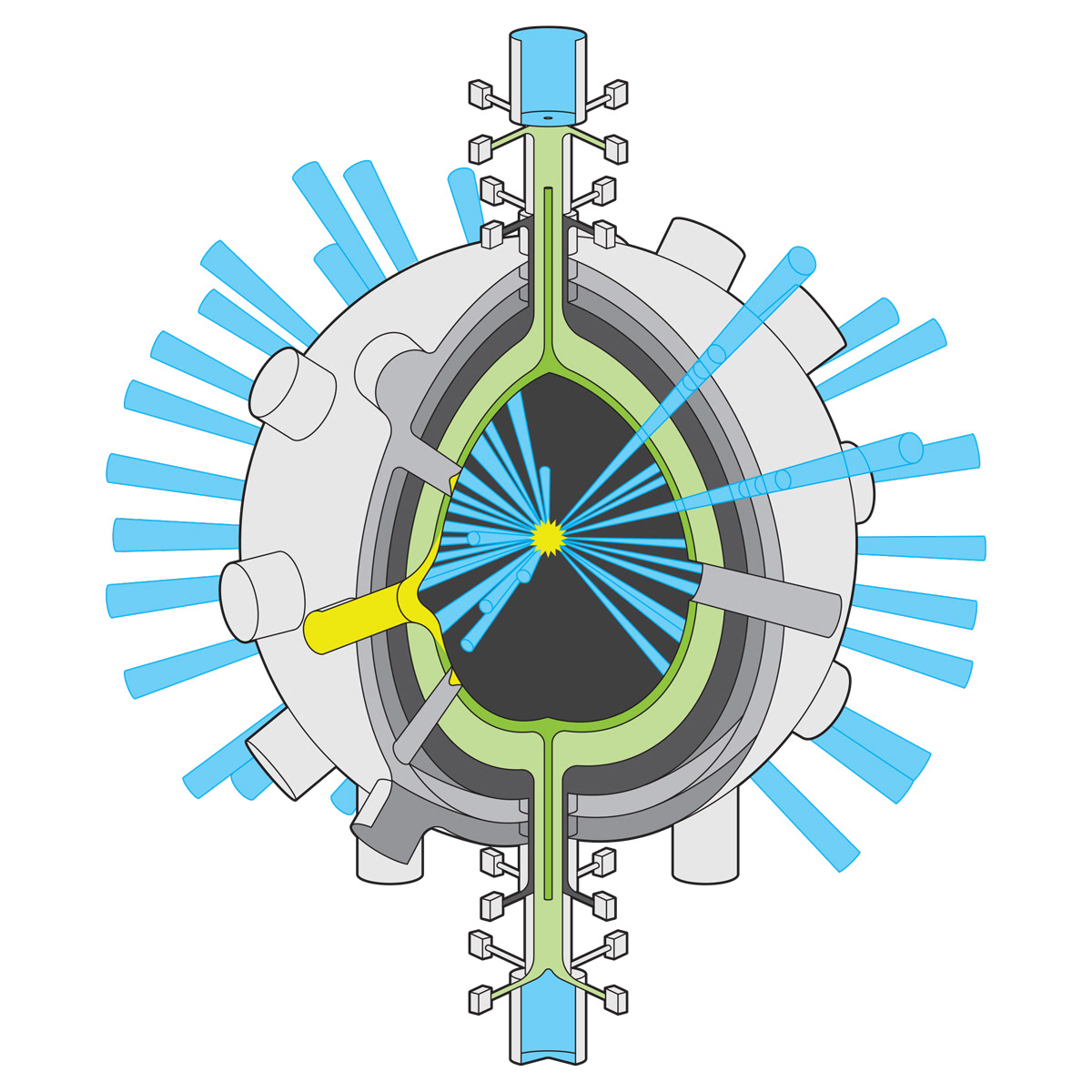С помощью магнитного поля, создаваемого сверхпроводящей магнитной системой, расположенной снаружи камер, плазма отжимается к оси. При этом устраняется непосредственный контакт высокотемпературной плазмы со стенкой. Полностью ионизированная плазма не излучает, как обычные газы и материалы при невысоких температурах, однако в конкретном случае характеризуется тормозным излучением ядер, поскольку их скорость поперек оси камер гасится магнитным полем.