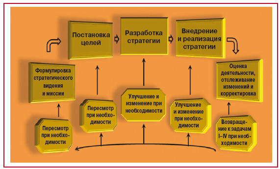 5. Оценка результатов и корректировка стратегического видения, глобальных целей, стратегии и ее реализации с учетом приобретенного опыта, изменившихся условий, появления новых идей и возможностей (рис. 2.1).