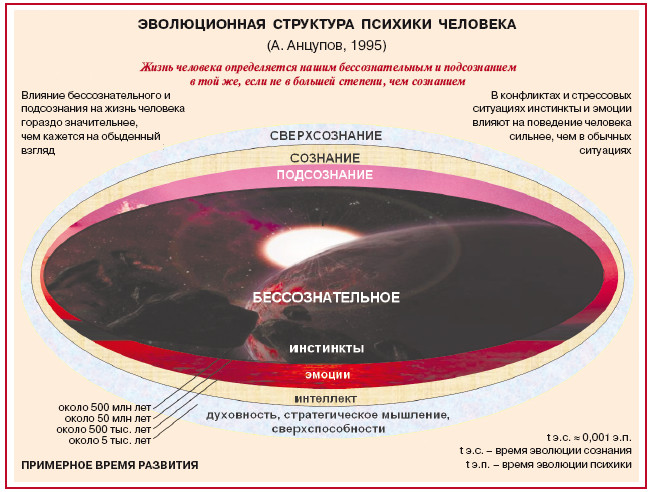 Если представить время макроэволюции психики в виде отрезка длиною 1 м, то сознанию будет соответствовать отрезок длиною 1 мм, а подсознанию – 10 см. Время эволюции сознания в процессе развития жизни на Земле составляет примерно 0,001 от времени эволюции бессознательного.
