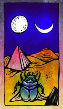 Ночь. Пустыня. На небе ярко светит луна. Но при этом на небе месяц, который находится в несвойственном для него положении. По пескам ползёт священный скарабей в сторону пирамиды под луной и бархана из песка под месяцем. Он только что выполз из-под чёрной гладкой каменной плиты. Жук начинает расправлять крылья и готов к полёту.