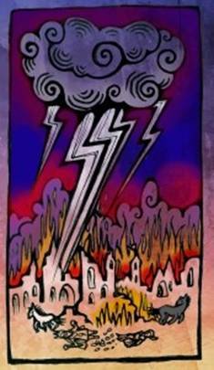 Город. Он полностью разрушен и полыхает в огне. Над горизонтом поднимается темный дым. На ночном небе большая чёрная туча. Из нее вырываются огромные молнии. Самая большая молния словно только что ударила в башню и разрушила её. Подле руин башни лежат мёртвый король и купец. На земле рассыпаны золотые монеты. В разные стороны разбегаются кони, белый и