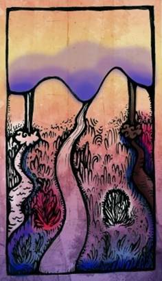 Мы видим сине-фиолетовое вересковое поле. Поле разделяет дорога, которая ведет в даль и проходит между двух гор. Со склонов гор стекают водопады и образую две реки: чёрную и белую. Около белой реки мы видим участок поля с белым вереском. Около чёрной реки мы видим участок поля с красным вереском. Также на поле по разным сторонам дороги мы видим два куста, или участка вереска красного и белого цвета.