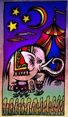 Ночь. На небе месяц и три звезды. В сторону шатра шагает слон. На нём красная с золотым узором накидка. Свой хобот он закрутил в спираль словно несёт невидимое бревно. Слон шагает по цветам, но цветы, по которым он прошёл не сломались и в порядке. От шагов слона по земле идут волны, ощущается вибрация. Над слоном вдали стремительно пролетает пара птиц.