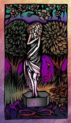 Летний сад. Посреди него стоит на камне статуя женщины. Над ней ветви с цветами. Позади стоят два дерева. Одно с немного пожелтевшей листвой. Их корни сплетаются в петлю под землей, под камнем.