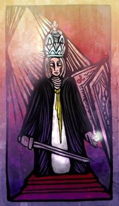 На лестнице стоит судья. Глаза его закрыты. Он одет в чёрную мантию с золотой завязкой. В правой руке он держит меч. Левой рукой он указывает вниз. На руке кольцо. На его голове корона, которая состоит из трех частей. За спиной у него большая книга. Далее, позади, треугольное отверстие, из которого льется свет на судью.