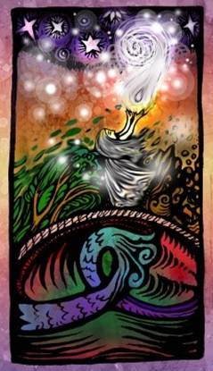 Земной шар. На нём стоит девушка и протягивает руки к небу. С неба к ней летит светящаяся частица. Вокруг нее штормовой ветер, который сносит деревья и камни. Под землей река, она образует петлю.