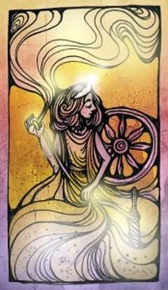 Молодая золотоволосая девушка сидит за веретеном и прядет. Она собирает воедино два потока «пряжи» сверху и снизу. Чистая золотистая «пряжа» – сверху. Светлая «пряжа» с чёрными вкраплениями – снизу. Два потока «пряжи» соединяются в руках женщины и сматываются веретеном.