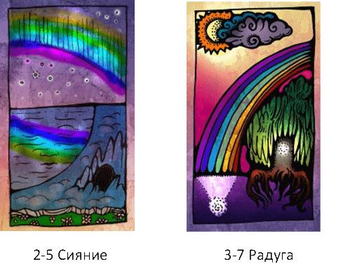 3. Косвенная двусторонняя, глиф к отличному глифу. В двух картах присутствует схожие по смыслу или символизму глифу, но немного отличные, по существу, и изображению. Связь работает в обе стороны. Такие связи редки. Пример карта 2-5 Сияние и 3-7 Радуга и соответствующие глифы «Сияние и озеро/Радуга и озеро».