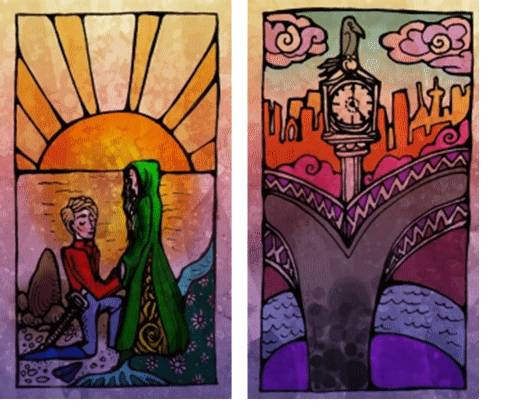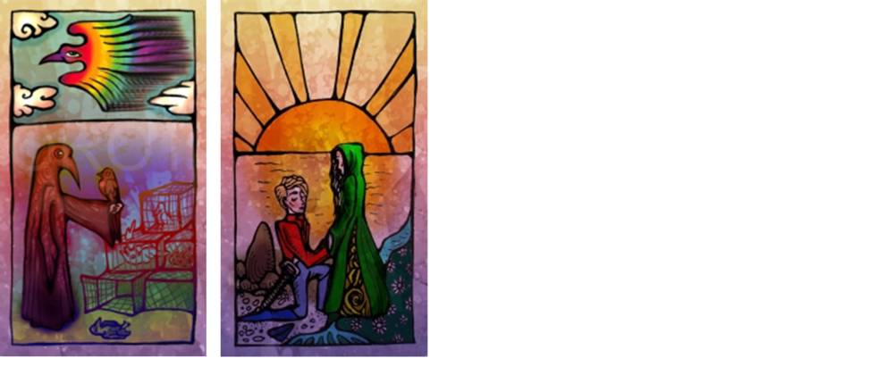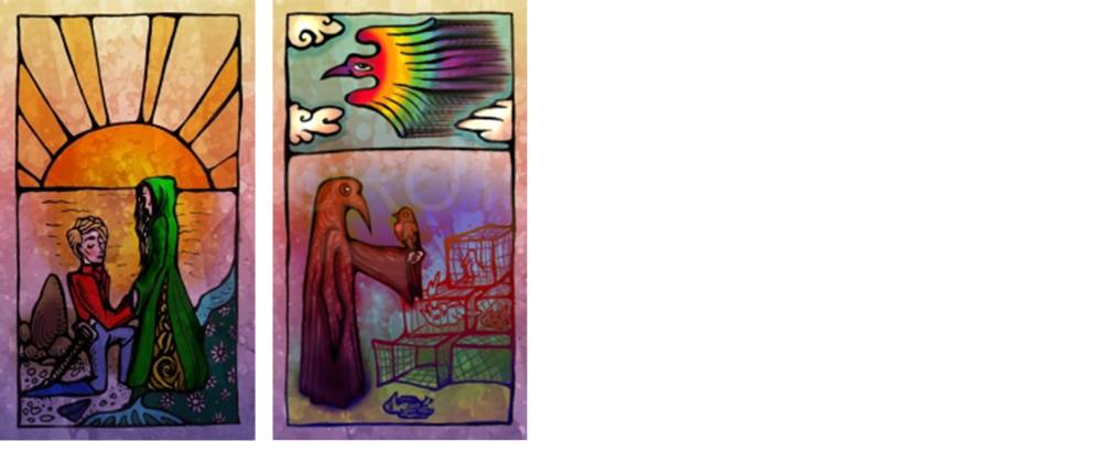 Ключи для размышлений. Заметьте – общая линия горизонта, солнце и разноцветная птица, мужчина и женщина/человек и птица, река с потоками/клетки с птицами. Карты «Начала» (жизнь земная) и «Конца» (прообраз суда небесного и Царства).