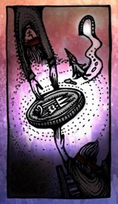 Посреди тёмного пространства или помещение витает большая серебряная монета. К этой монете тянутся двое с завязанными глазами красной повязкой. Один словно падает сверху. Другой взбирается по лестнице к монете. Рядом внизу очень тёмное место, которая ощущается как гиблое. Вдали по дорожке к выходу идёт третий человек. Он оставил позади себя сумку, на его голове треугольный колпак. По дорожке к выходу разбросаны мелкие монетки.