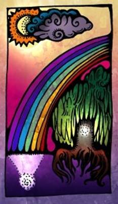 Время суток не определенное, или утро, или вечер. На небе яркое солнце и грозовые тучи. Над спокойной гладью воды радуга. Там, где начинается радуга в воде из некого источника исходит белый свет. Под радугой растет большое дерева, корни которого уходят в воду. Это дерево в своем стволе содержит сферу.