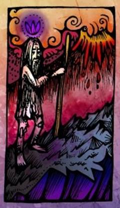 Босой человек в изорванных одеждах и с посохом в руке идёт вверх по чёрной скале. Скала имеет острые выступы и обрыв. Над головой человека светится фиолетовый лотос. На горизонте виднеется вулкан, который извергается.