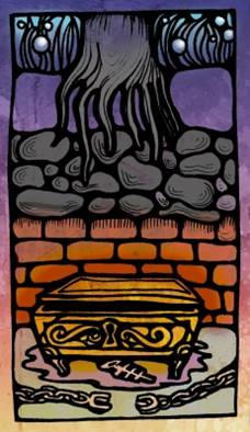 Сюжет карты: На карте изображен спрятанный ларец или шкатулка, сделанная из золота. Она спрятана в тайном месте, которое находится глубоко под водой, корнями дерева, грунтом и грудой булыжников. Место создано человеком, построено из обработанных камней или кирпича и служит для защиты и скрытия ларца. Несмотря на то, что ларец надежно спрятан, мы видим, что он открыт. На неполную надежность хранилища нам намекает лужа под ларцом. Около ларца лежит необычный ключ и расцепленные цепи. Ларец приоткрыт, но мы не видим какой артефакт лежит в нем и есть ли он вообще.