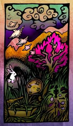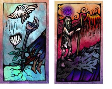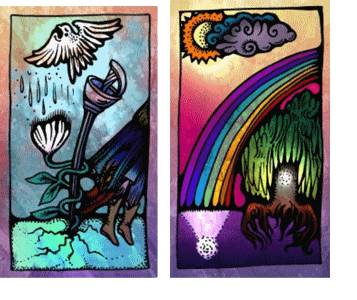 Слейте воедино две карты. Где была земля с трещинами, вода с карты «Радуга» заполнила трещины земли и выровняла поверхность. Шпага растворилась и превратилась в белый свет на воде. Цветок теперь опора и большое дерево. Над радугой пролетает белый голубь, напоминая, что вы не одни, и показывая путь. Все впереди!