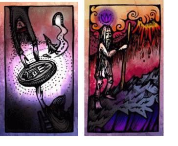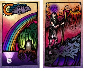 Заглянем в душу вашего странника и посмотрим сколько он прошел. Для этого рассмотрим карту «Радуга» и карту «Странник» вместе. Скала на карте «Странник» – это вода на карте «Радуга», посох – это дерево, цветок – это радуга, сам странник – это светящийся шар на карте «Радуга» в дереве и отражение в воде.