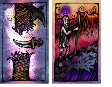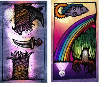Давайте сопоставим частичку из карты «Кинжал» и светящуюся сферу в воде из карты «Радуга». Сопоставляются? Чтобы частичка легла на гладь воды, она должна быть освобождена от уз каната. Разрыв каната символизирует смерть, а вода очищение и воскрешение. Истинный духовный путь начинается через условную смерть. Смерть старого человека и рождение нового.