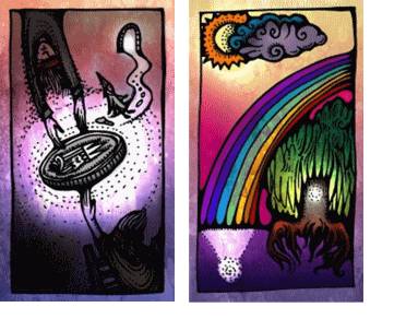 Посмотрите на две карты вместе «Монета» и «Радуга». В карте «Монета» светящийся объект – это большая монета. В карте «Радуга» – отражение в воде, светящиеся сфера. Сопоставьте эти два элемента из разных карт. Получается? Ответ должен быть однозначным – «нет». Если вы все же как-то сопоставили эти объекты – посмотрите, как монета, будучи вместо сферы в воде исказила радугу. Это уже не радуга. Если такая сфера вернется в дерево, дерево просто умрет.