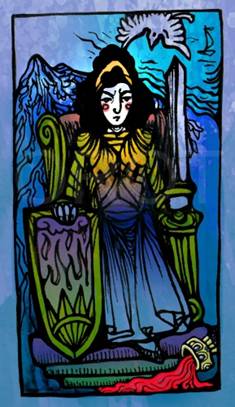 1. На троне женщина в доспехах. Представьте, что вы сейчас перед ней. Она грозно на вас смотрит. Она видит вас насквозь, всю вашу жизнь, все ваши плохие и хорошие дела. В руке у ней меч. Она обладает безграничной властью. Вы абсолютно бессильны перед ней. От её решения зависит ваша жизнь.