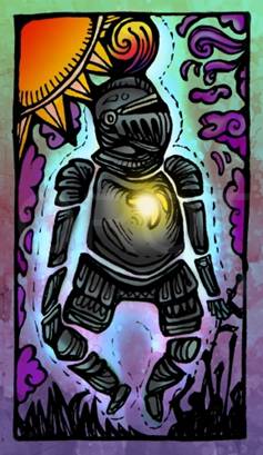 В воздухе, словно пушинка, летают стальные доспехи. Они светятся. На шлеме красно-золотистое перо. В щели забрала ничего не видно. Солнце отражается в стали доспехов. Доспехи окружают темные облака, но они не могут к ним прикоснуться. Где-то внизу шумят войны.