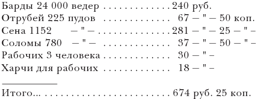 На 100 быков, откармливаемых на барде, потребно для присмотра помимо приказчика 3 человека батраков; цена каждому батраку 10 рублей на хозяйских харчах. Принимая во внимание все эти издержки, получим следующую цифру расходов, потребных ежемесячно по откармливанию бардою 100 быков: