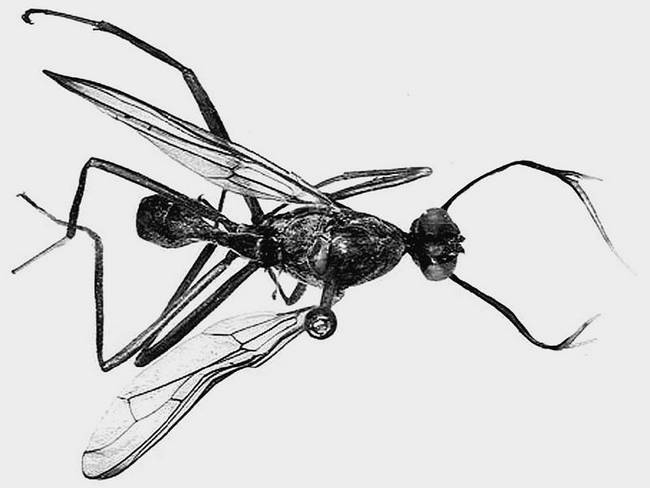 Одним из таких созданий являются обитающие в тропических лесах Новой Гвинеи мухи-перистокрылки Phytalmia cervicomis, самцы которых обзавелись внушительными рогами. Эти мухи – любопытнейшие создания: вытянутое туловище, узкие крылья, удлиненное брюшко, тонкие ноги – и рога, которые в сравнении с мухой выглядят довольно внушительно и представляют собой выросты на щеках, которые самец насекомого носит всю жизнь. С их же помощью он в брачных дуэлях добивается внимания со стороны самок.