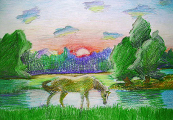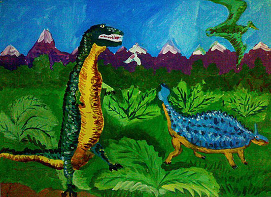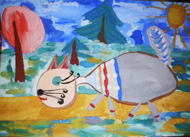 Взяла я в руки карандаш,Стала рисовать пейзаж,А потом вошла я в раж,Применив пастель, гуашь.Древний мир изобразила —Получилось очень мило.