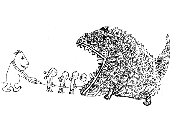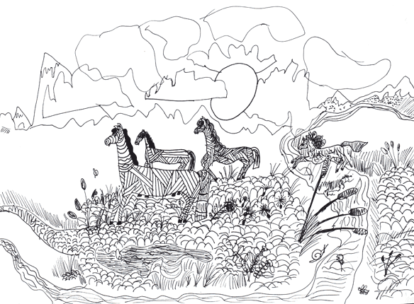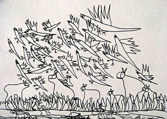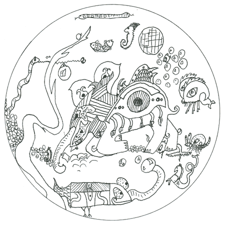 Рисунок странен. Очень даже.Влияние Босха? Кто-нибудь скажет?Бурна фантазия, бьёт ключом…Бумаге, однако, всё нипочём.