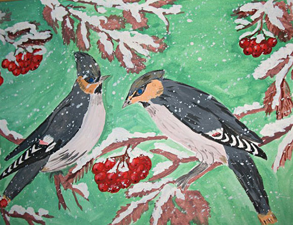 Зимняя рябина за моим окошкомВзгляд мой приковала красненьким горошком.Свиристелей пара в гости прилетела —Пусть клюют рябину ради жизни дела.