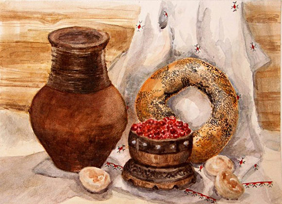 Рисунок приятный, раскрашен опрятно —Кувшин с молоком завалился на бок.Кувшин не обычный, а очень занятный —Ловит мышей он в свой желобок.