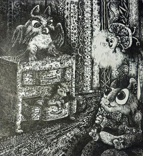 Что за чудо-комната —Страшно интересно!Ничто не перевернуто,Но тайны есть завеса.На комоде – филин.Сторожит пространство,Но видно он бессиленЗакончить хулиганство.Лампочки-проказницы,Что бегает по шторам…Так нельзя себя вестиСветовым приборам.А вот бычок из ящикаНоровит наружу —Поощренья филинаОн тоже не заслужит.Лишь родственник коалы(Достаточно далекий)Сидит в углу устало,Словно на уроке —Ему достанется наградаНа конкурсе симпотных гадов!