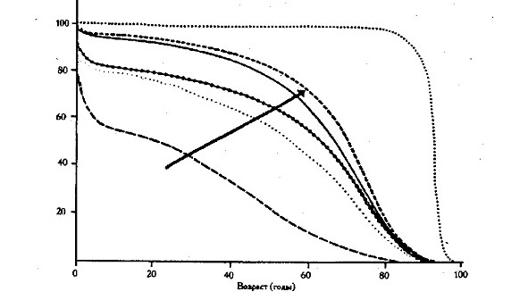 В ходе развития человечества благодаря развитию гигиены и медицины кривая выживаемости выпрямляется (рис. 5.2).