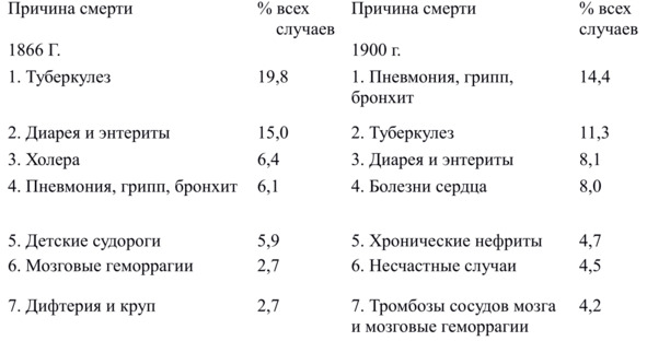 При этом структура смертности претерпевает серьёзные изменения. На место инфекционных заболеваний приходят хронические и системные заболевания (таблица 5.1). Можно заметить, что в 1866 г. болезни сердца вообще не фигурировали в списке десяти основных причин смерти. Однако уже в 1930 г. они стали основной причиной смерти.