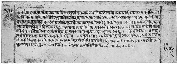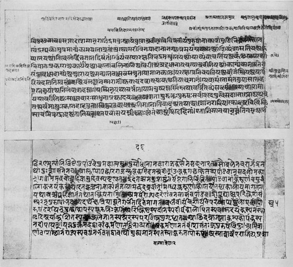 Рис. 1.3. Факсимиле двух страниц из рукописи Махабхараты (книга пятая – Удьйогапарва), написанной на бумаге письменами деванагари, около 1566 года. Взято из [83], вклейка между с. 288–289. А почему не приводят фотографии более ранних рукописей Махабхараты? Не шестнадцатого, а скажем, второго века? Наверное потому, что сам Эпос был создан в эпоху XIV–XVI веков, а самая ранняя имеющаяся сегодня рукопись относится именно в XVI веку. Или позже.