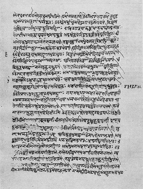 Рис. 1.4. «Страница из рукописи Махабхараты (книга четвертая – Виратапарва), писанной на бумаге письменами шарада (около 1708 г.)» [82], с. 117. Буквы как бы свисают с верхней линии, «висят на нити». Тоже поздняя рукопись.